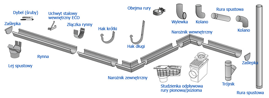 Jedną z zalet naszego systemu, oprócz tradycyjnego sposobu montażu, jest zastosowanie specjalnych wewnętrznych uchwytów stalowych ECO, co poprawia estetykę, ułatwia montaż oraz stanowi o atrakcyjności cenowej naszego produktu. Ponadto w systemie zastosowaliśmy złączkę rynny o zamknięciu klamrowym wyposażoną w długowieczną uszczelkę EPDM, która zapewnia zawsze idealną szczelność.